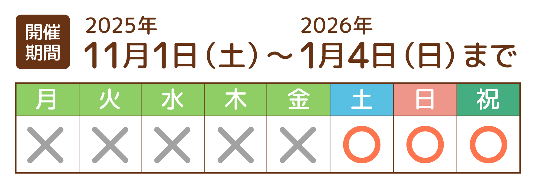 【開催期間】2025 年11 月1 日(土)~ 2026 年1 月4 日(日)までの土・日・祝